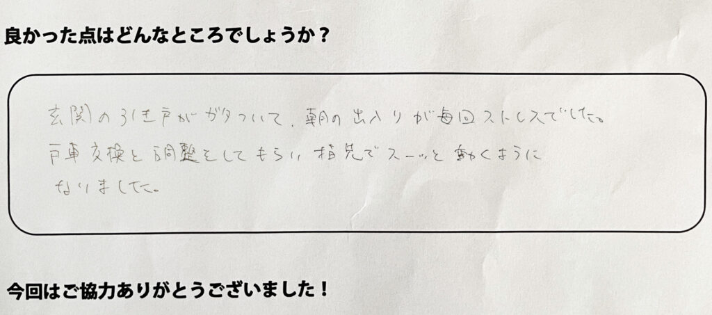玄関の引き戸がガタついて、朝の出入りが毎回ストレスでした。戸車交換と調整をしてもらったら、指先でスーッと動くようになり本当に助かりました。