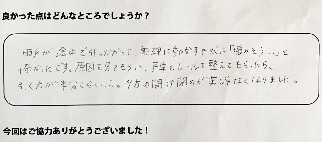 戸車交換で動きが軽くなり、イヤな音もほぼゼロに。家族から「静かになったね」と言われました。